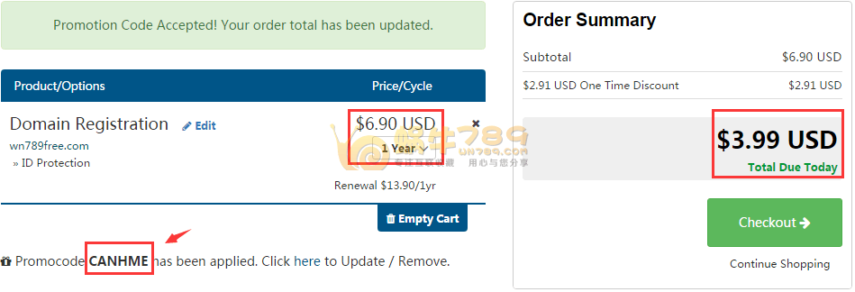 目前此商家又推出了万圣节(Halloween)促销活动,新注册域名只需3.99美元/首年(注册的时候显示6.99美元,付款界面直接变成3.99美元),之前还赠送隐私保护,目前好像已经不再赠送。
