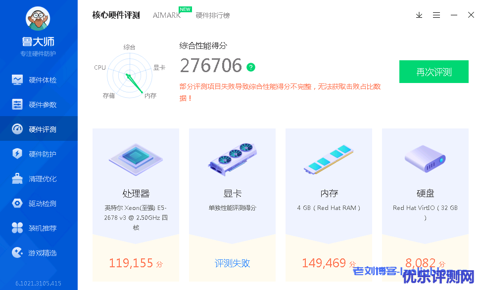 亿云互联云挂机宝鲁大师跑分结果,其中,挂机宝没装显卡,因此评测失败。综合性能得分276706,属于一等好级别:7-9万分算是中等,10-15万算是中上等,15-20万分就很不错了,20万分以上算是一等好。