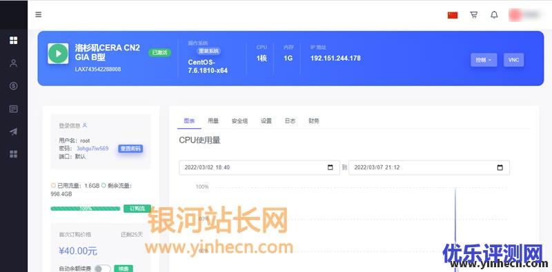 TmhHost采用智简魔方管理面板,功能还是很丰富的,虽然没有阿里云腾讯云这样的大厂云的后台那么功能繁多,眼花缭乱,但是该有的功能都有。进入产品管理后就是仪表盘,可以查看自定义时间段内的CPU、硬盘IO、内存和流量的使用情况;功能操作方面除了可以开关机、重启等基本操作外,还提供VNC远程控制,设置安全组、挂载自定义ISO、设置启动项等等。