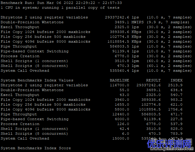 然后,我们再用UnixBench跑个分测试一下性能,最后得分是693.6分(这个分数被水印遮挡住了,理解一下)