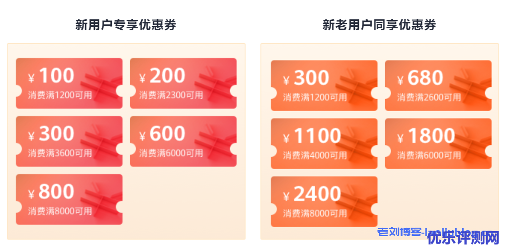 新老用户同享优惠券:消费满1200元-300元;消费满2600元-680元;消费满4000-1100元;消费满6000-1800元;消费满8000-2400元。
