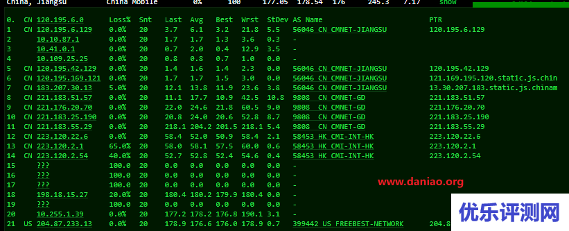 Traceroute to China, Guangzhou CM (TCP Mode, Max 30 Hop) ============================================================ traceroute to 120.196.212.25 (120.196.212.25), 30 hops max, 32 byte packets 1 204.87.233.1 10.72 ms timestamp is error 2 10.255.1.38 10.75 ms timestamp is error 3 10.255.1.18 10.81 ms timestamp is error 4 218.30.48.185 10.83 ms timestamp is error 5 59.43.189.41 160.79 ms timestamp is error 6 * 7 59.43.130.157 158.84 ms timestamp is error 8 202.97.55.218 161.69 ms timestamp is error 9 * 10 221.183.90.193 159.80 ms timestamp is error 11 221.176.22.185 180.66 ms timestamp is error 12 111.24.5.189 166.58 ms timestamp is error 13 111.24.5.30 156.85 ms timestamp is error 14 211.136.204.69 162.86 ms timestamp is error 15 211.136.203.6 166.48 ms timestamp is error 16 * 17 * 18 * 19 120.196.212.25 169.75 ms timestamp is error