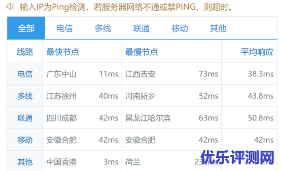 我们使用的网上的第三方工具测试全国各地Ping的情况,可以看到电信和联通都延迟都在50ms以内。移动网络应该是这个测试节点有问题的,我本地移动网络延迟也在60ms左右。所以整体来看三网Ping的延迟都还是不错的。